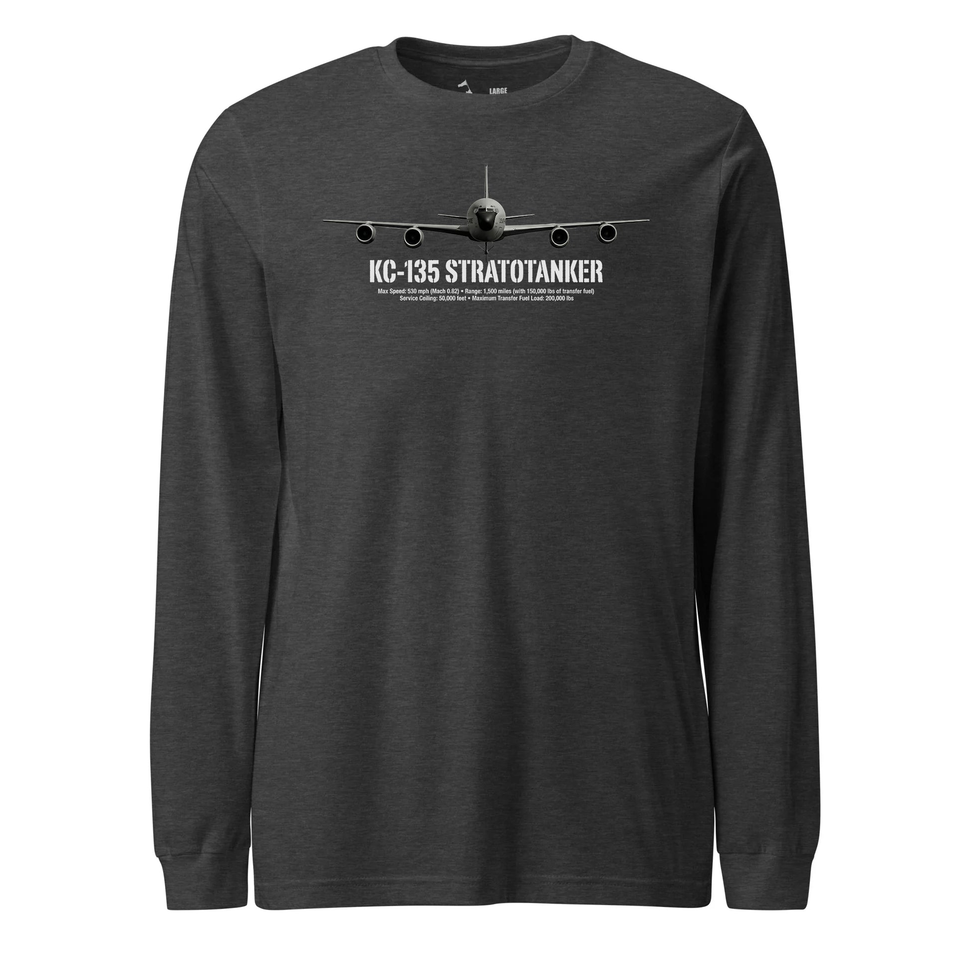 Celebrate the legendary KC-135 Stratotanker with this KC-135 Stratotanker Airframe Specs Long Sleeve T-Shirt. Featuring detailed technical specifications and engineering data from the Air Force's longest-serving aerial refueling aircraft, this premium tee honors the unsung hero of American air power – the flying gas station that has extended the reach of every combat aircraft in the U.S. inventory for over six decades, making possible missions that would otherwise be impossible and victories that would otherwise be unthinkable.